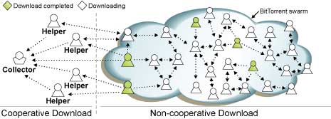 Tribler integra un nuovo protocollo di download coperativo che fa uso di gruppi sociali, dove i membri tra cui si è instaurata fiducia cooperano per migliorare la velocità di download. I Peer di un gruppo sociale che decidono di partecipare ad un download cooperativo assumono uno dei due ruoli: sono o collezionisti (collectors) o aiutanti (helpers) (vedi fig sotto). Un collezionista è un peer interessato ad ottenere una copia completa di un file, ed un aiutante è un peer incaricato da un collezionista per assisterlo a scaricare quel file. Sia il collezionista che gli aiutanti cominciano a scaricare il file usando il protocollo BitTorrent ed usando le estensioni per un download cooperativo. Prima di cominciare un download, un aiutante chiede al collezionista quale chunk deve ancora scaricare. Dopo aver scaricato un chunk, l'helper lo invia al collezionista senza chiedergli nulla in cambio. Oltre a ricevere chunk dai suoi aiutanti, il collezionista ottimizza la sua performance di download selezionando dinamicamente la migliore fonte di dati disponibile dall'insieme di aiutanti ed altri peer sulla rete BitTorrent. Gli aiutanti danno priorità al collezionista e perciò vengono preferiti come fonti di dati.
